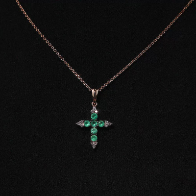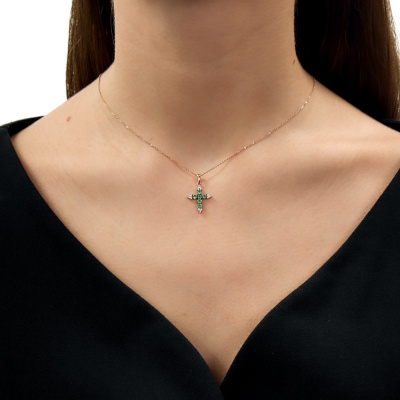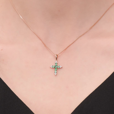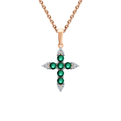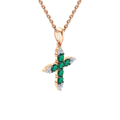 Подвеска с 12 бриллиантами природными, 0.08 карат, огранка круг 57 граней, цвет 3, чистота 6, тип огранки А; 6 изумрудами природными, 0.29 карат, цвет 3, чистота 3, тип огранки В; Розовое золото 585 пробы.