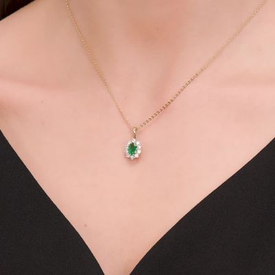 Подвеска с 10 бриллиантами природными, 0.38 карат, огранка круг 57 граней, цвет 3, чистота 6, тип огранки А; 1 изумрудом природным, 0.68 карат, цвет 3, чистота 3, тип огранки Б; Желтое золото 585 пробы.