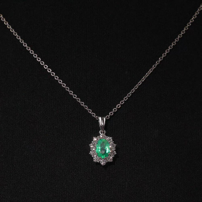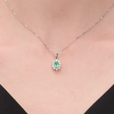 Подвеска с 10 бриллиантами природными, 0.38 карат, огранка круг 57 граней, цвет 3, чистота 6, тип огранки А; 1 изумрудом природным, 0.68 карат, цвет 3, чистота 3, тип огранки Б; Белое золото 585 пробы.