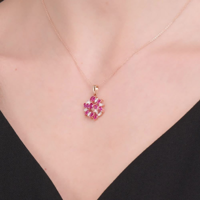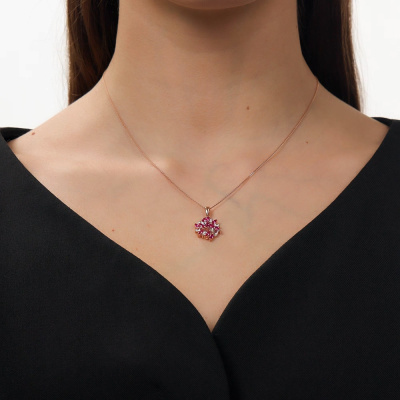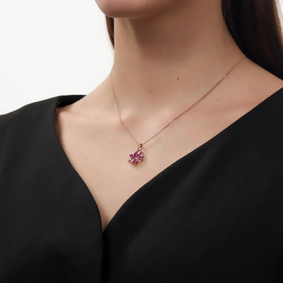 Подвеска с 8 бриллиантами природными, 0.01 карат, огранка круг 17 граней, цвет 2, чистота 2, тип огранки А; 1 рубином синтетическим, 0.14 карат; 10 рубинами синтетическими, 0.81 карат; Розовое золото 585 пробы.