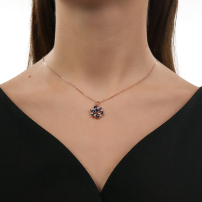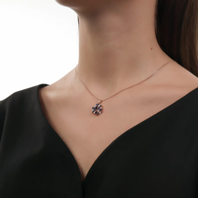 Подвеска с 8 бриллиантами природными, 0.01 карат, огранка круг 17 граней, цвет 2, чистота 2, тип огранки А; 1 сапфиром синтетическим, 0.15 карат; 10 сапфирами синтетическими, 0.79 карат; Розовое золото 585 пробы.