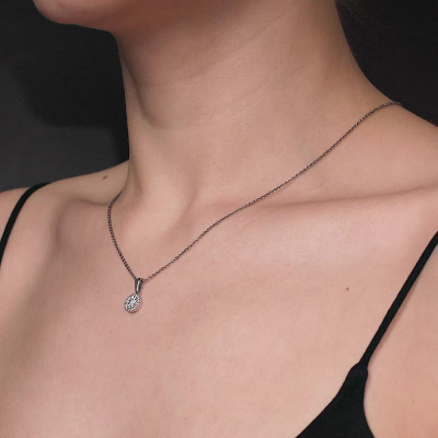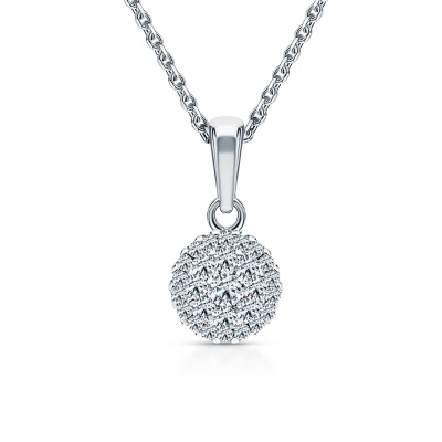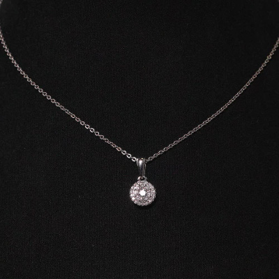 Подвеска с 1 бриллиантом природным, 0.08 карат, огранка круг 57 граней, цвет 3, чистота 6, тип огранки А; 8 бриллиантами природными, 0.11 карат, огранка круг 57 граней, цвет 3, чистота 6, тип огранки А; 18 бриллиантами природными, 0.09 карат, огранка круг 57 граней, цвет 3, чистота 6, тип огранки А; Белое золото 585 пробы.