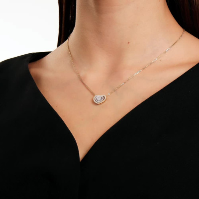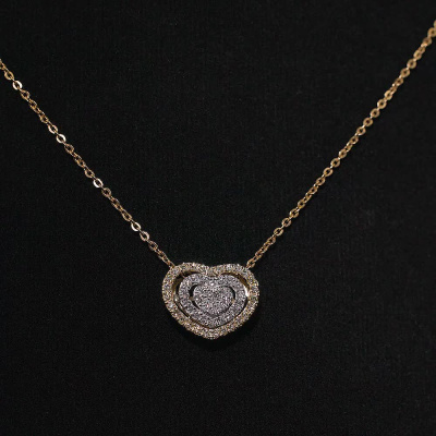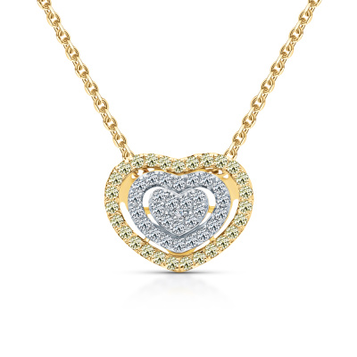 Подвеска с 28 бриллиантами природными, 0.19 карат, огранка круг 57 граней, цвет 3, чистота 6, тип огранки А; 27 бриллиантами желтыми природными, 0.2 карат, огранка круг 57 граней, цвет 5, чистота 7, тип огранки А; Желтое и белое золото 585 пробы.