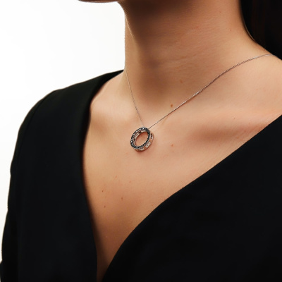 Подвеска с 32 бриллиантами природными, 0.42 карат, огранка круг 57 граней, цвет 3, чистота 6, тип огранки А; 32 бриллиантами черными природными облагороженными, 0.47 карат, огранка круг 57 граней, цвет 7, чистота 6, тип огранки А; Белое золото 585 пробы.