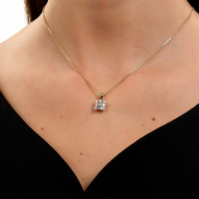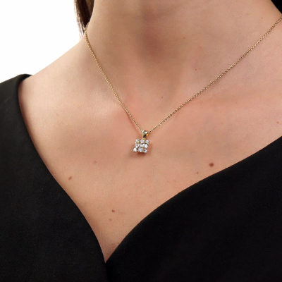 Подвеска с 4 бриллиантами природными, 0.3 карат, огранка круг 57 граней, цвет 3, чистота 6, тип огранки А; 4 бриллиантами природными, 0.21 карат, огранка круг 57 граней, цвет 3, чистота 6, тип огранки А; 1 бриллиантом природным, 0.03 карат, огранка круг 57 граней, цвет 3, чистота 6, тип огранки А; Желтое золото 585 пробы.