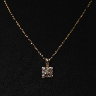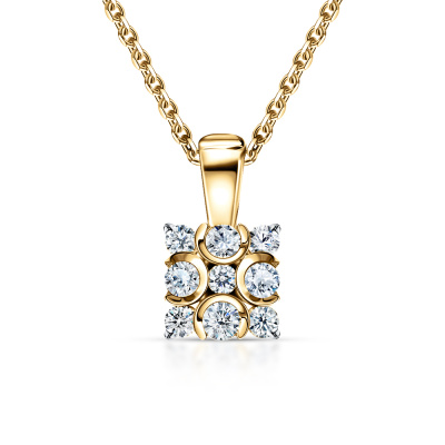 Подвеска с 4 бриллиантами природными, 0.3 карат, огранка круг 57 граней, цвет 3, чистота 6, тип огранки А; 4 бриллиантами природными, 0.22 карат, огранка круг 57 граней, цвет 3, чистота 6, тип огранки А; 1 бриллиантом природным, 0.03 карат, огранка круг 57 граней, цвет 3, чистота 6, тип огранки А; Желтое золото 585 пробы.