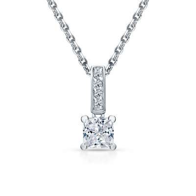 Подвеска с 1 бриллиантом природным, 0.5 карат, огранка принцесса 65 граней, цвет 3, чистота 5, тип огранки А; 4 бриллиантами природными, 0.03 карат, огранка круг 57 граней, цвет 3, чистота 6, тип огранки А; Белое золото 585 пробы.