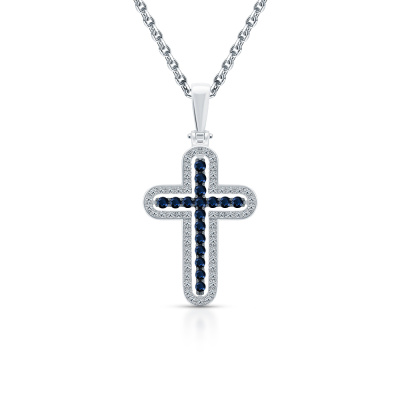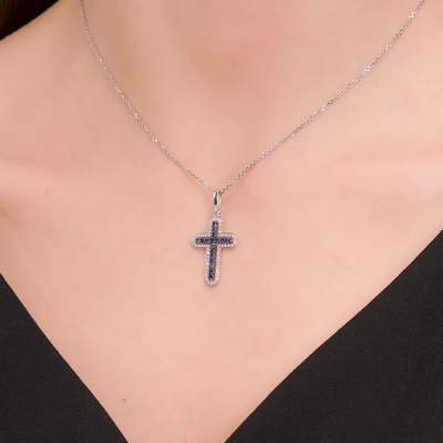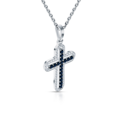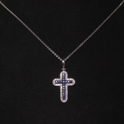 Подвеска с 55 бриллиантами природными, 0.12 карат, огранка круг 17 граней, цвет 2, чистота 2, тип огранки А; 17 сапфирами природными, 0.33 карат, цвет 2, чистота 2, тип огранки В; Белое золото 585 пробы.