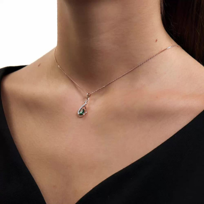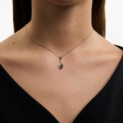 Подвеска с 11 бриллиантами природными, 0.03 карат, огранка круг 17 граней, цвет 2, чистота 2, тип огранки А; 2 бриллиантами природными, 0.004 карат, огранка круг 17 граней, цвет 2, чистота 2, тип огранки А; 1 гидротермальным изумрудом, 0.33 карат; Розовое золото 585 пробы.