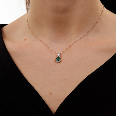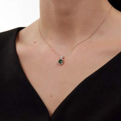 Подвеска с 21 бриллиантом природным, 0.06 карат, огранка круг 17 граней, цвет 2, чистота 2, тип огранки Б; 1 гидротермальным изумрудом, 0.82 карат; Розовое золото 585 пробы.