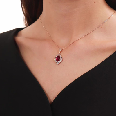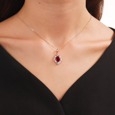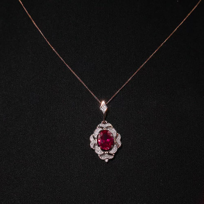 Подвеска с 2 бриллиантами природными, 0.01 карат, огранка круг 17 граней, цвет 2, чистота 2, тип огранки А; 24 бриллиантами природными, 0.08 карат, огранка круг 17 граней, цвет 2, чистота 2, тип огранки А; 1 рубином синтетическим, 2.18 карат; Розовое золото 585 пробы.