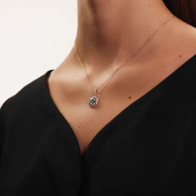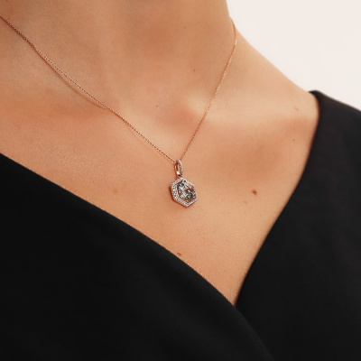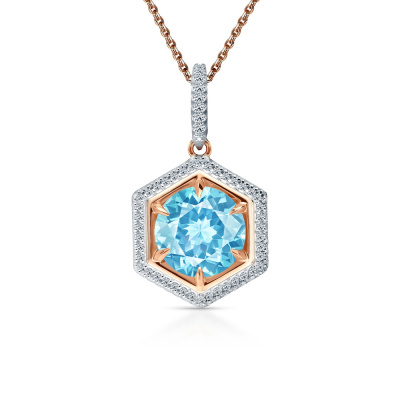 Подвеска с 50 бриллиантами природными, 0.1 карат, огранка круг 17 граней, цвет 2, чистота 2, тип огранки А; 1 топазом скай природным, 2.1 карат, огранка круг чекер; Розовое золото 585 пробы.
