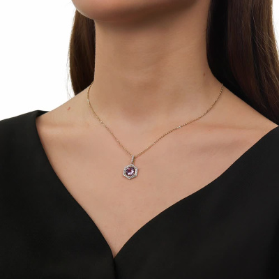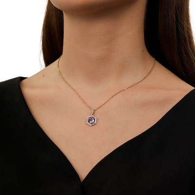 Подвеска с 50 бриллиантами природными, 0.11 карат, огранка круг 17 граней, цвет 2, чистота 2, тип огранки Б; 1 аметистом природным, 1.67 карат; Желтое золото 585 пробы.