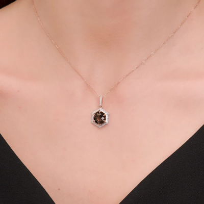 Подвеска с 50 бриллиантами природными, 0.1 карат, огранка круг 17 граней, цвет 2, чистота 2, тип огранки А; 1 кварцем дымчатым природным, 1.58 карат, огранка круг чекер; Розовое золото 585 пробы.