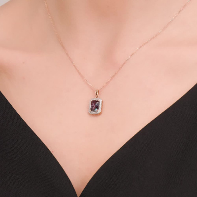 Подвеска с 24 бриллиантами природными, 0.09 карат, огранка круг 17 граней, цвет 2, чистота 2, тип огранки А; 1 александритом синтетическим, 1.9 карат; Розовое золото 585 пробы.