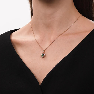 Подвеска с 1 гидротермальным изумрудом, 0.49 карат; 12 сапфирами бесцветными природными, 0.5 карат; Розовое золото 585 пробы.