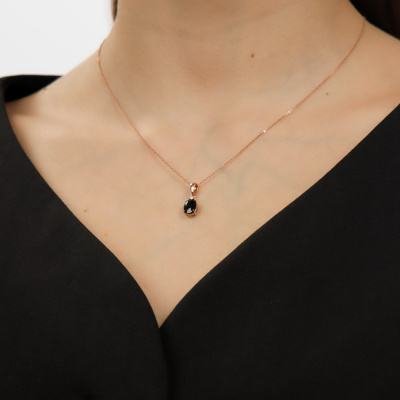 Подвеска с 1 бриллиантом природным, 0.02 карат, огранка круг 57 граней, цвет 3, чистота 6, тип огранки А; 1 сапфиром природным, 1.49 карат, цвет 2, чистота 2, тип огранки Б; Розовое золото 585 пробы.