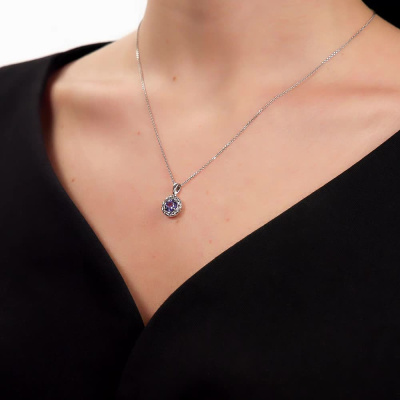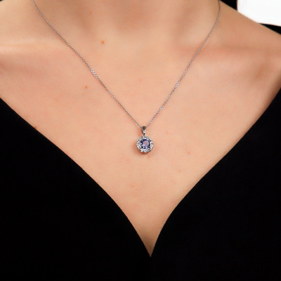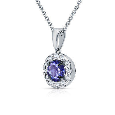 Подвеска с 1 танзанитом природным, 0.83 карат; 12 сапфирами бесцветными природными, 0.43 карат; Белое золото 585 пробы.