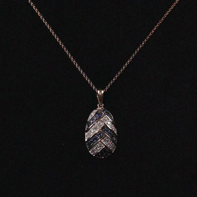 Подвеска с 15 бриллиантами природными, 0.21 карат, огранка круг 57 граней, цвет 3, чистота 6, тип огранки А; 3 бриллиантами природными, 0.02 карат, огранка круг 57 граней, цвет 3, чистота 6, тип огранки А; 18 сапфирами природными, 0.35 карат, цвет 2, чистота 2, тип огранки В; 1 сапфиром природным, 0.01 карат, цвет 2, чистота 2, тип огранки В; Розовое золото 585 пробы.