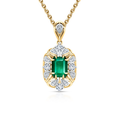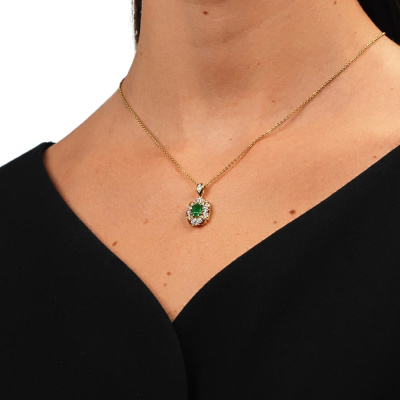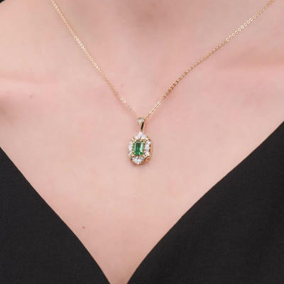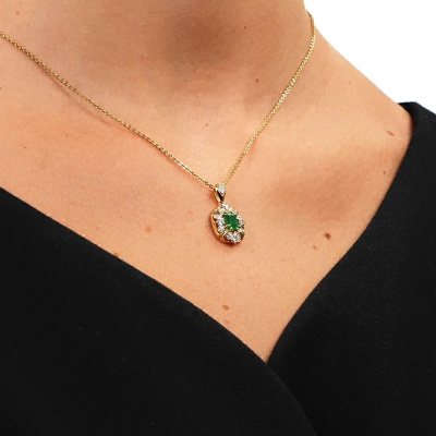 Подвеска с 4 бриллиантами природными, 0.23 карат, огранка круг 57 граней, цвет 3, чистота 6, тип огранки А; 9 бриллиантами природными, 0.06 карат, огранка круг 57 граней, цвет 3, чистота 6, тип огранки А; 1 изумрудом природным, 0.78 карат, цвет 3, чистота 3, тип огранки Б; Желтое золото 585 пробы.