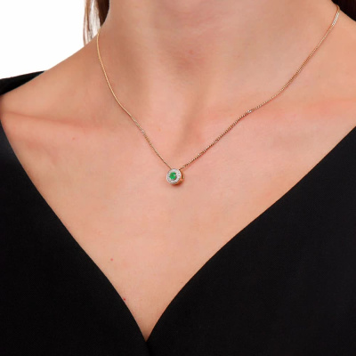 Подвеска с 15 бриллиантами природными, 0.04 карат, огранка круг 17 граней, цвет 2, чистота 2, тип огранки А; 1 изумрудом природным, 0.15 карат, цвет 3, чистота 3, тип огранки В; Желтое золото 585 пробы.