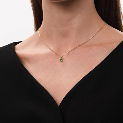 Подвеска с 4 бриллиантами природными, 0.01 карат, огранка круг 17 граней, цвет 2, чистота 2, тип огранки А; 1 изумрудом природным, 0.15 карат, цвет 3, чистота 3, тип огранки В; Желтое золото 585 пробы.
