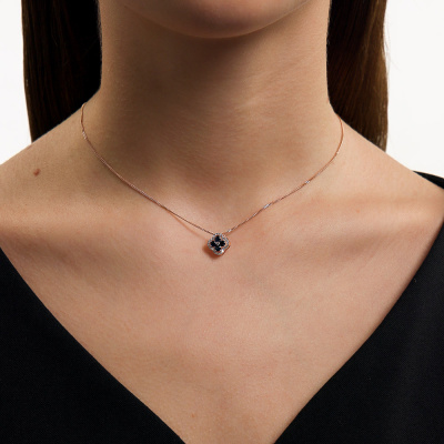 Подвеска с 24 бриллиантами природными, 0.06 карат, огранка круг 17 граней, цвет 2, чистота 2, тип огранки А; 4 сапфирами природными, 0.4 карат, цвет 2, чистота 2, тип огранки В; Розовое золото 585 пробы.
