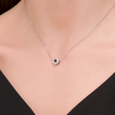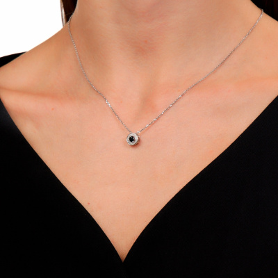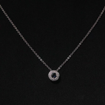 Подвеска с 15 бриллиантами природными, 0.04 карат, огранка круг 17 граней, цвет 2, чистота 2, тип огранки А; 1 сапфиром природным, 0.23 карат, цвет 2, чистота 2, тип огранки В; Белое золото 585 пробы.