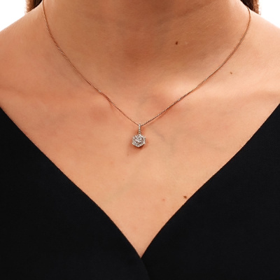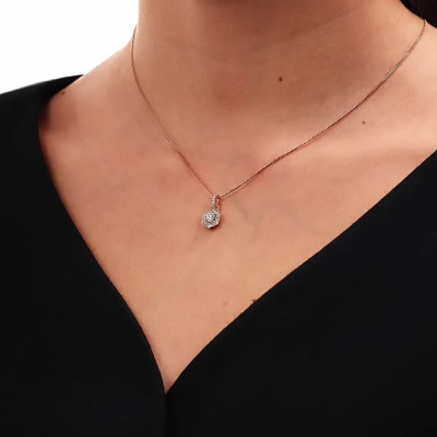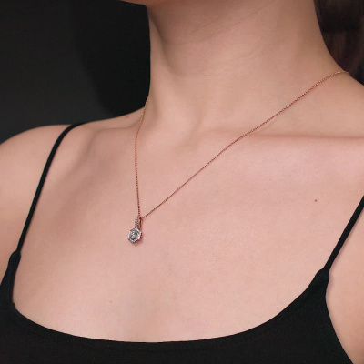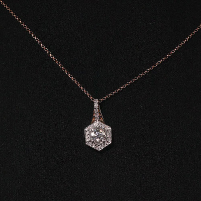 Подвеска с 1 бриллиантом природным, 0.31 карат, огранка круг 57 граней, цвет 3, чистота 6, тип огранки А; 5 бриллиантами природными, 0.03 карат, огранка круг 57 граней, цвет 3, чистота 6, тип огранки А; 18 бриллиантами природными, 0.07 карат, огранка круг 17 граней, цвет 2, чистота 2, тип огранки А; Розовое золото 585 пробы.