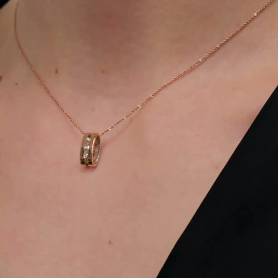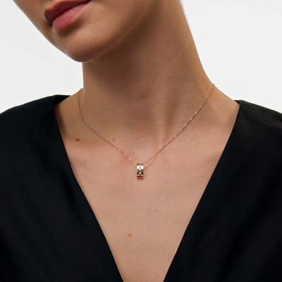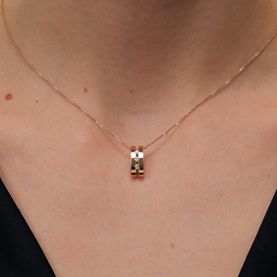 Подвеска с 3 бриллиантами природными, 0.01 карат, огранка круг 57 граней, цвет 4, чистота 5, тип огранки А; 3 бриллиантами черными природными облагороженными, 0.02 карат, огранка круг 57 граней, цвет 7, чистота 6, тип огранки А; Розовое и белое золото 585 пробы.