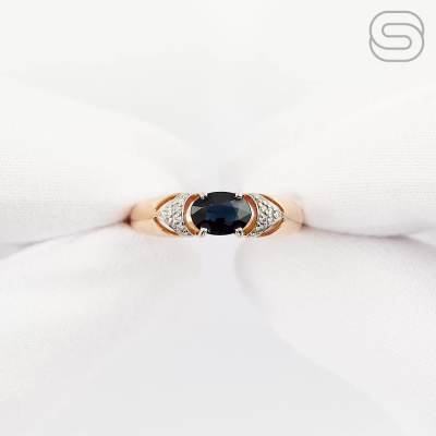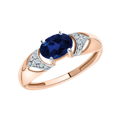 Кольцо с 8 бриллиантами природными, 0.038 карат, огранка круг 57 граней, цвет 4, чистота 5, тип огранки А; 10 бриллиантами природными, 0.032 карат, огранка круг 57 граней, цвет 4, чистота 5, тип огранки А; 1 сапфиром природным, 0.997 карат, цвет 2, чистота 2, тип огранки Б; Розовое золото 585 пробы.