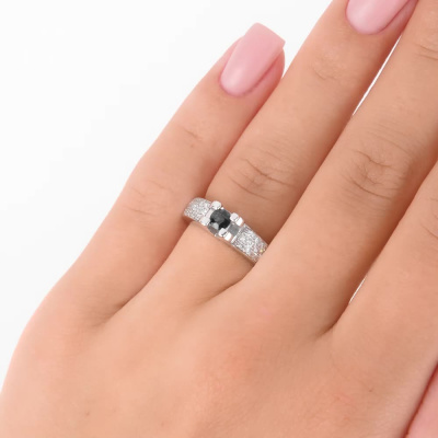 Кольцо с 26 бриллиантами природными, 0.14 карат, огранка круг 57 граней, цвет 4, чистота 6, тип огранки А; 1 сапфиром природным, 0.23 карат, цвет 2, чистота 2, тип огранки В; Белое золото 585 пробы.