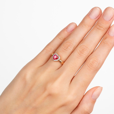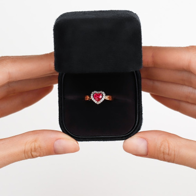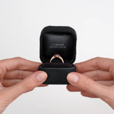 Приобретая это прекрасное кольцо, вы получаете элегантное сочетание стиля и блеска. Состоящее из 17 бриллиантов общим весом 0,07 карата, огранка которых имеет 17 граней, оно приковывает взгляды своим изысканным дизайном. Красивый синтетический рубин весом 0,602 карата добавляет кольцу шарм и загадочность. Сочетание с розовым золотом 585 пробы придает ему особую изящность. Это кольцо станет идеальным выбором для особых моментов или ценным приобретением для вашей коллекции украшений.