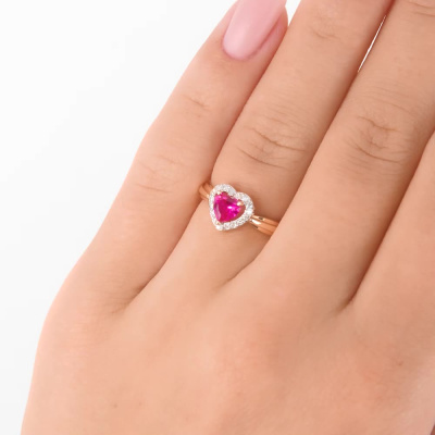 Кольцо с 17 бриллиантами природными, 0.06 карат, огранка круг 17 граней, цвет 2, чистота 2, тип огранки А; 1 рубином синтетическим, 0.57 карат; Розовое золото 585 пробы.