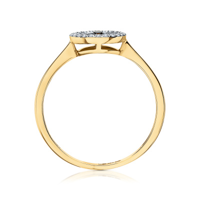 Кольцо с 22 бриллиантами природными, 0.05 карат, огранка круг 17 граней, цвет 2, чистота 3, тип огранки Б; 4 бриллиантами черными природными облагороженными, 0.3 карат, огранка круг 57 граней, цвет 7, чистота 6, тип огранки А; Желтое золото 585 пробы.