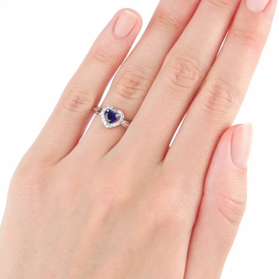 Кольцо «Бриллианты Якутии» с 1 сапфиром синтетическим, 0.57 карат, тип огранки Б; 17 бриллиантами, 0.082 карат, огранка круг 17 граней, цвет 2, чистота 2, тип огранки Б; Белое золото 585 пробы.