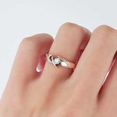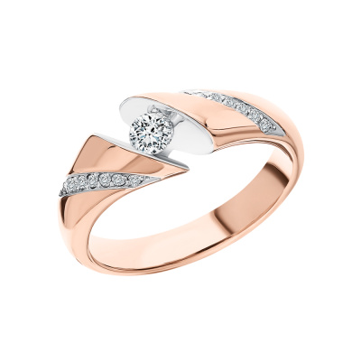Кольцо с 1 бриллиантом природным, 0.13 карат, огранка круг 57 граней, цвет 3, чистота 6, тип огранки А; 16 бриллиантами природными, 0.06 карат, огранка круг 17 граней, цвет 2, чистота 2, тип огранки Б; Розовое золото 585 пробы.