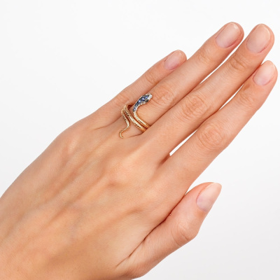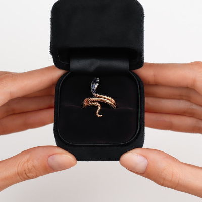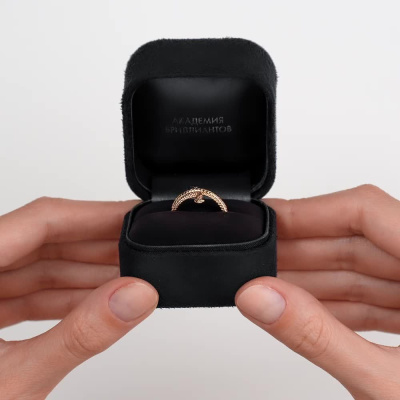 Кольцо с 14 бриллиантами природными, 0.03 карат, огранка круг 17 граней, цвет 2, чистота 2, тип огранки Б; 1 сапфиром природным, 0.04 карат, цвет 2, чистота 2, тип огранки В; 2 сапфирами природными, 0.02 карат, цвет 2, чистота 2, тип огранки В; 4 сапфирами природными, 0.01 карат, цвет 2, чистота 3, тип огранки В; 2 бриллиантами черными природными облагороженными, 0.007 карат, огранка круг 57 граней, цвет 7, чистота 9, тип огранки А; Розовое золото 585 пробы.