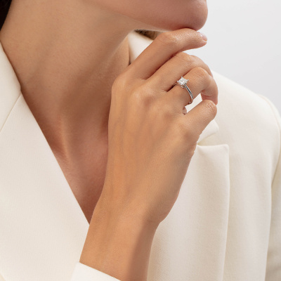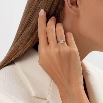 Кольцо с 1 бриллиантом природным, 0.7 карат, огранка принцесса 65 граней, цвет 4, чистота 6, тип огранки А; Белое золото 585 пробы.