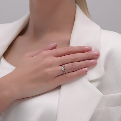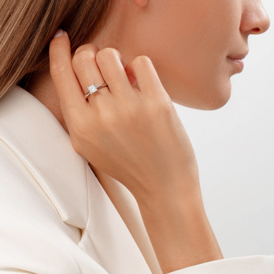 Кольцо с 1 бриллиантом, 0.9 карат, огранка принцесса 65 граней, цвет 2, чистота 6, тип огранки А; Белое золото 585 пробы.
