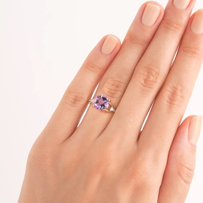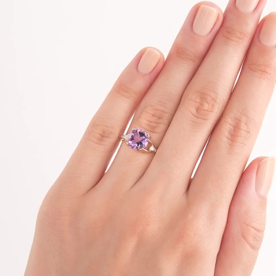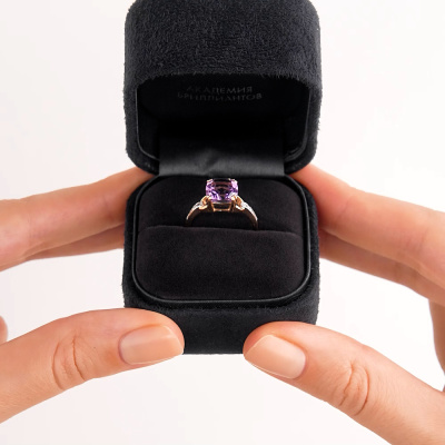 Кольцо с 10 бриллиантами природными, 0.02 карат, огранка круг 17 граней, цвет 2, чистота 2, тип огранки Б; 1 аметистом природным, 1.88 карат; Розовое золото 585 пробы.