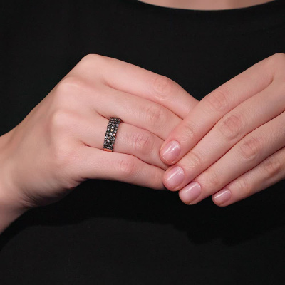 Кольцо с 20 бриллиантами коньячными, 0.62 карат, огранка круг 57 граней, цвет 7, чистота 6, тип огранки А; 19 бриллиантами, 0.26 карат, огранка круг 57 граней, цвет 4, чистота 6, тип огранки А; Розовое золото 585 пробы.
