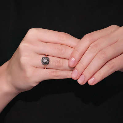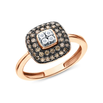 Кольцо с 4 бриллиантами природными, 0.01 карат, огранка круг 17 граней, цвет 2, чистота 3, тип огранки Б; 40 бриллиантами коньячными природными, 0.29 карат, огранка круг 57 граней, цвет 7, чистота 6, тип огранки А; Розовое золото 585 пробы.