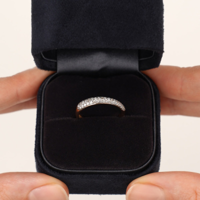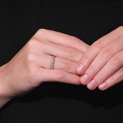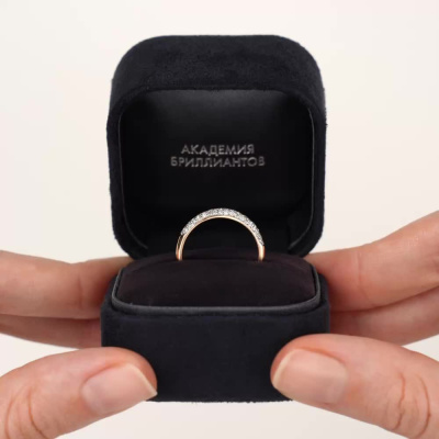 Кольцо с 21 бриллиантом природным, 0.14 карат, огранка круг 17 граней, цвет 2, чистота 2, тип огранки Б; 21 бриллиантом природным, 0.11 карат, огранка круг 17 граней, цвет 2, чистота 2, тип огранки Б; 10 бриллиантами природными, 0.04 карат, огранка круг 17 граней, цвет 2, чистота 2, тип огранки Б; Розовое золото 585 пробы.