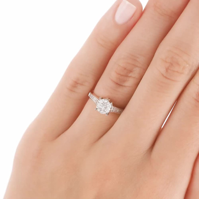 Кольцо с 1 бриллиантом природным, 0.07 карат, огранка круг 57 граней, цвет 3, чистота 6, тип огранки А; 6 бриллиантами природными, 0.12 карат, огранка круг 57 граней, цвет 3, чистота 6, тип огранки А; 6 бриллиантами природными, 0.04 карат, огранка круг 57 граней, цвет 3, чистота 6, тип огранки А; 18 бриллиантами природными, 0.04 карат, огранка круг 17 граней, цвет 2, чистота 2, тип огранки А; Розовое и белое золото 585 пробы.
