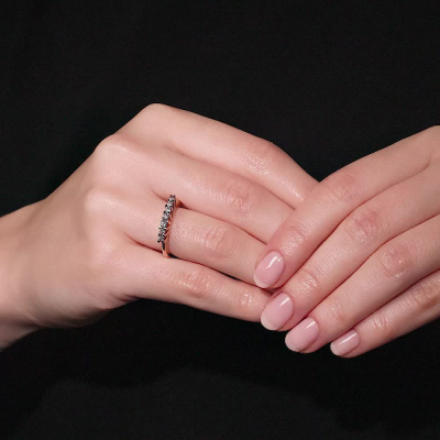 Кольцо с 3 бриллиантами природными, 0.15 карат, огранка круг 57 граней, цвет 3, чистота 6, тип огранки А; 4 бриллиантами природными, 0.12 карат, огранка круг 57 граней, цвет 3, чистота 6, тип огранки А; Розовое золото 585 пробы.