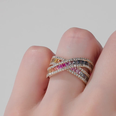 Кольцо с 106 бриллиантами природными, 0.57 карат, огранка круг 17 граней, цвет 2, чистота 3; 31 сапфиром мульти, 1.91 карат; Желтое золото 585 пробы.