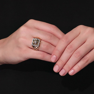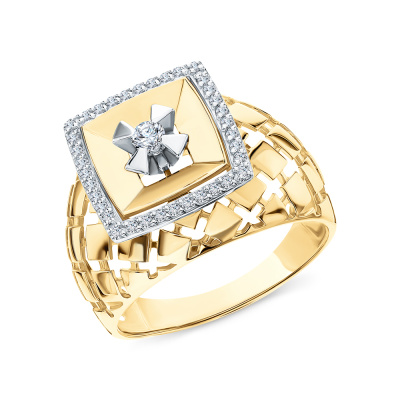 Кольцо с 1 бриллиантом природным, 0.08 карат, огранка круг 57 граней, цвет 3, чистота 6, тип огранки А; 36 бриллиантами природными, 0.15 карат, огранка круг 57 граней, цвет 3, чистота 6, тип огранки А; Желтое и белое золото 585 пробы.
