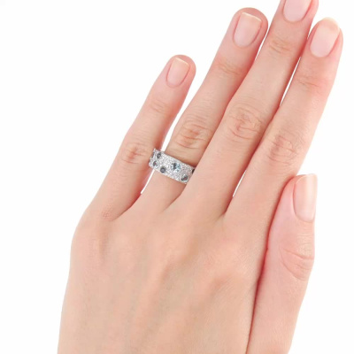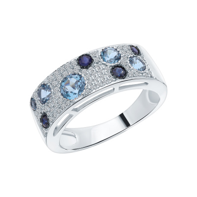 Кольцо с 63 бриллиантами природными, 0.14 карат, огранка круг 17 граней, цвет 2, чистота 3, тип огранки Б; 5 топазами лондон природными, 0.75 карат; 4 сапфирами природными, 0.13 карат, цвет 3, чистота 3, тип огранки В; Белое золото 585 пробы.