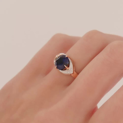 Кольцо с 6 бриллиантами природными, 0.02 карат, огранка круг 17 граней, цвет 2, чистота 2, тип огранки А; 1 сапфиром синтетическим, 2.29 карат; Розовое золото 585 пробы.